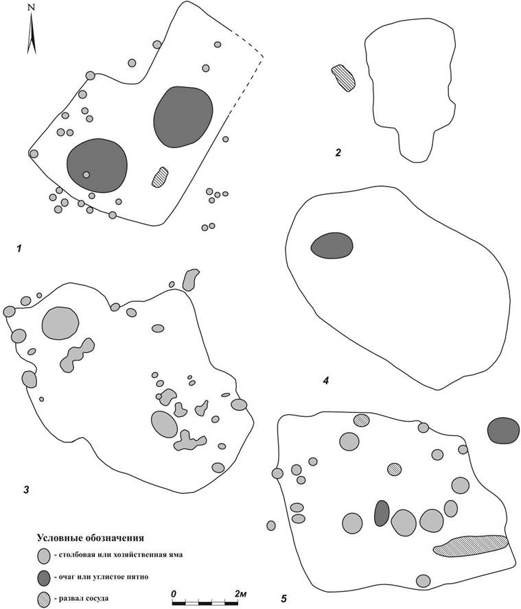 Рисунок 1 – Жилищные комплексы елшанской ранненеолитической культуры. 1 – Вьюново озеро I; 2 – Утюж I; 3 – Имерка VII; 4 – Луговое III; 5 – Лебяжинка IV