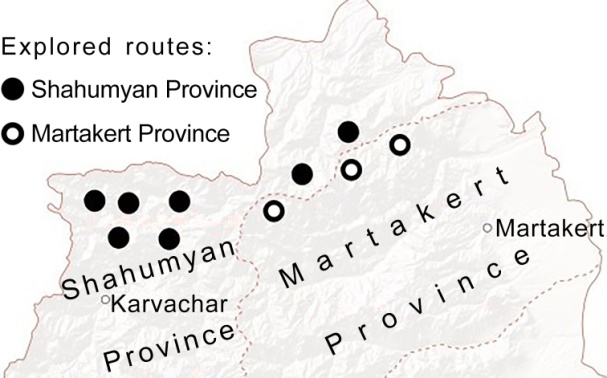 The population of bezoar goats living in the Mrav mountain range was the object of our studies. The material for the work was the data collected by us in the mentioned mountain range from 1999 to 2022. For observations, we have selected stations in two parts of the Mrav mountain range, Shahumyan and Martakert, where we have carried out observations by route-hiking methods in different years (fig. 1). In each station, we have implemented 15 calculation routes, each 10 km long. We calculated the length of the route using the “Easy Fit” pedometer program on the phone. Routes are pre-selected based on location, terrain and weather conditions. Every year we made monthly observations, the calculations were made by 4–5 participants and lasted 7 days (fig. 1).