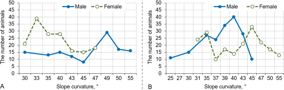 Our observations have revealed that in the Mrav mountain range, as well as in other mountains, preference is given to those mountain slopes where there are terraces, outcrops, niches that serve as shelters, which is also proven by literary data [20; 21]. Analyzes of the winter distribution of bezoar goats depending on hillside slope indicate that they appear on slopes of 30–57°. As can be seen from figure 2 (A), females are found in winter at maximum 47° slopes, the number of which is 0.6% of the number of studied animals, and the vast majority of males prefer to stay at 45–55° slopes. Compared to females, males prefer more rocky places in winter, as we think, for defense purposes, because during mating season they lose weight, become exhausted and weak and vulnerable to predators.