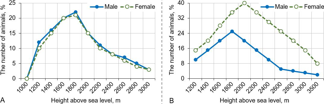 In contrast to the winter period, significant differences in the distribution of males and females are observed in summer (fig. 3: B). In summer, females occupy the altitudes of 1200–3500m asl and the main part is located at the altitudes of 1600–2800 m asl. And in the meantime, the males are found at the altitudes of 1400–2200 m asl.