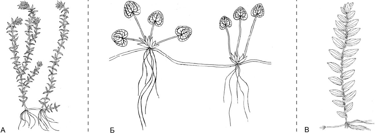 Рисунок 1 – Объекты исследования. А – Elodea canadensis Michx., Б – Hydrocharis morsus-ranae L., В – Potamogeton perfoliatus L.