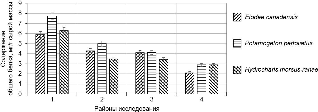 Анализ полученных данных с применением двухфакторного дисперсионного анализа (модель I) показал, что между фактором 1 – местообитание, фактором 2 – вид и содержание общего белка в листьях гидрофитов обнаружено высокозначимое взаимодействие (F = 213,99, Р < 10⁻⁶; F = 40,08, Р < 10⁻⁶). То есть содержание общего белка уменьшалось в условиях загрязнения водоема (левый берег, 1 км выше черты города (контроль) > левый берег, центральный пляж, в черте города > правый берег, в черте города > левый берег, 500 м ниже места сброса сточных вод с БОСК МУП «Водоканал»).