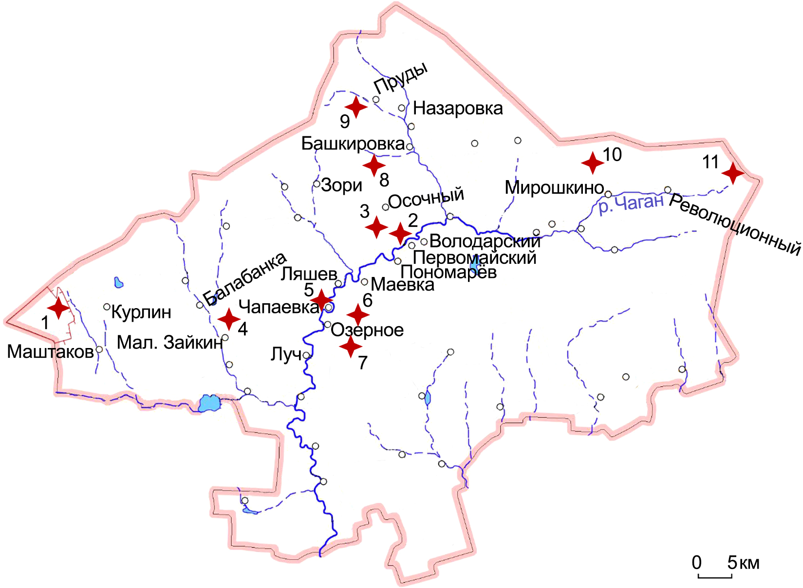 Рисунок 1 – Карта-схема Первомайского района с отмеченными поселениями байбака. 1 – «Таловская степь»; 2 – «У телевышки»; 3 – «Андреев дол»; 4 – окр. п. Балабанка, у песчаного карьера; 5 – окр. с. Чапаевка; 6 – окр. с. Озерное, 700 м к востоку; 7 – окр. с. Озерное, 900 м к югу; 8 – исток реки Коневская Башкирка; 9 – исток реки Быковская Башкирка; 10 – окр. п. Мирошкино; 11 – исток реки Чаган