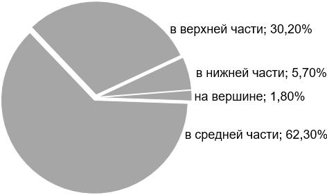 На территории участка «Таловская степь» (поселение № 1) и в окр. с. Озерное (поселения № 6 и № 7) из 8 исследованных колоний только 1 располагалась по склону холма (участок «Таловская степь»), а остальные 7 на более или менее выровненной территории. На остальных исследуемых территориях поселения степного сурка находились на пологих склонах. Таким образом, 423 норы, 97 из которых гнездовые, располагаются на склоне. При этом большая часть нор (62,3%) располагается в средней части склонов (рис. 3).