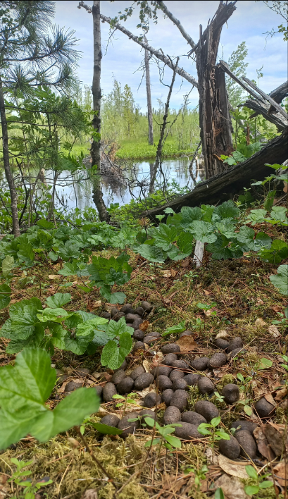 В ходе маршрутного учёта в разных ассоциациях кедровника кустарничково-зеленомошного обнаружили экскременты лося европейского (Alces alces L., 1758; Mammalia: Cetartiodactyla, Cervidae), полёжку и экскременты бурого медведя (Ursus arctos L., 1758; Mammalia: Carnivora, Ursidae) (рис. 4, 7, 8).