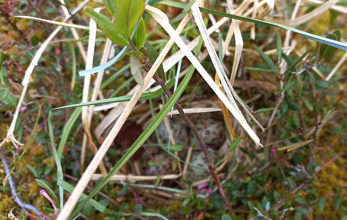Кустарничковый ярус сформирован багульником болотным (Ledum palustre L.) (cop3), брусникой (Vaccínium vítis-idaéa) (cop1), голубикой (Vaccinium uliginosum L.) (sp), водяникой (Empetrum nigrum L.) (sp), морошкой (Rubus chamaemorus L.) (sp). Высота кустарничков не превышает 0,5–0,7 м. Участие трав незначительно. Наземный покров образован зелёными мхами Polytrichum sp., Hylocomium splendens (Hedw.) Schimp. Pleurozium schreberi (Willd. ex Brid.) Mitt., Ptilium crista-castrensis (Hedw.) De Not. Проективное покрытие травяно-кустарничкового яруса – 85%. По микроповышениям отдельными пятнами распределены синузии лишайников рода Сladina sp., Peltigera sp.