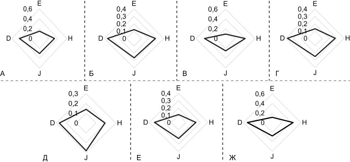 Анализ многомерных пиктографиков, рассматриваемых как качественные характеристики сообщества (выборки) и местообитания (ландшафта, участка), выраженные через количественные показатели информации [36, с. 615–619; 37, с. 36–39], показывает, что пиктографики сообществ разных биотопов и района исследования в целом при несколько различном масштабе имеют очень сходную форму и характеризуются уплощённостью по оси выравненности, особенно по оси индекса выравненности Шеннона (J), отражающего выравненность редких видов (рис. 12). Судя по изменениям формы пиктографиков в течение двух лет более стабильна структура сообщества мелких млекопитающих кедровника кустарничково-зеленомошного.