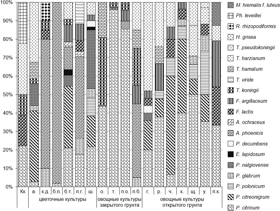 В результате исследований микобиоты контрольной почвы и ризосферы цветочных и овощных культур выделено 20 видов микроскопических грибов, относящихся к 9 родам: Penicillium (P. citrinum, P. citreonigrum, P. polonicum, P. glabrum, P. nalgiovense, P. decumbens), Eupenicillium (E. lapidosum), Aspergillus (A. ochraceus, A. phoenicis), Fusarium (F. argillaceum, F. lactis), Trichoderma (T. koningii, T. hamatum, T. harzianum, T. viride, T. pseudokoningii), Humicola (H. grisea), Phoma (Ph. leveillei), Rhizopus (R. rhizopodiformis), Mucor (M. hiemalis f. luteus) (рис. 1).