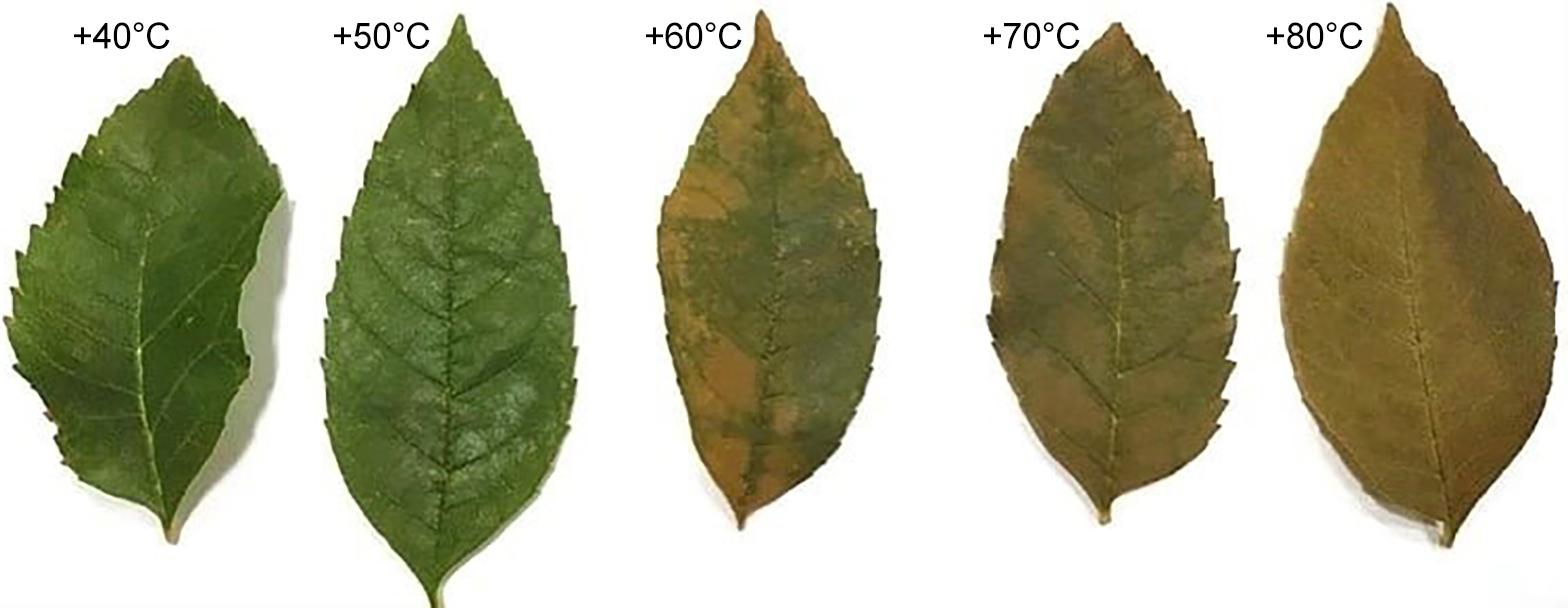 Методом, используемым в эксперименте для диагностики состояния зелёных насаждений, является определение жаростойкости по степени повреждения хлорофиллоносных тканей по Ф.Ф. Мацкову. Для эксперимента отбираются по 5 листов каждого вида дерева. Было исследовано 7 видов деревьев. Метод основан на том, чтобы подвергнуть исследуемый лист воздействию температур: +40°C, +50°C, +60°C, +70°C и +80°C. При наименьших температурах необходимо выдерживать 30 минут, а с последующих по 10 минут. При истечении нужного времени необходимо погрузить в холодную дистиллированную воду, а после просушки в раствор 0,2 Н соляной кислоты. Через 20 мин. необходимо учесть результаты. Мертвые растительные клетки приобретут бурый окрас. При повышении оптимальной для растения температуры происходит разрушение клеточной мембраны и, как следствие, изменение свойств ее полупроницаемости. Происходит проникновение кислого клеточного сока внутрь хлоропластов и вытеснение иона магния на ион водорода из молекулы хлорофилла, превращая его в вещество бурого цвета – феофитин. При более высоких температурах резко повышается проницаемость цитоплазматических мембран, а затем наступает коагуляция белков и отмирание клеток [8, с. 63; 9, с. 10; 10, с. 229]. Материалами служит: 1) свежие листья растений, различающихся по жаростойкости; 2) 0,2 Н раствор соляной кислоты; 3) водяная баня; 4) термометр; 5) пинцет; 6) чашки Петри (10 шт.); 7) стакан с водой; 8) карандаш по стеклу или маркер [11 с. 167; 12 с. 15–17].
