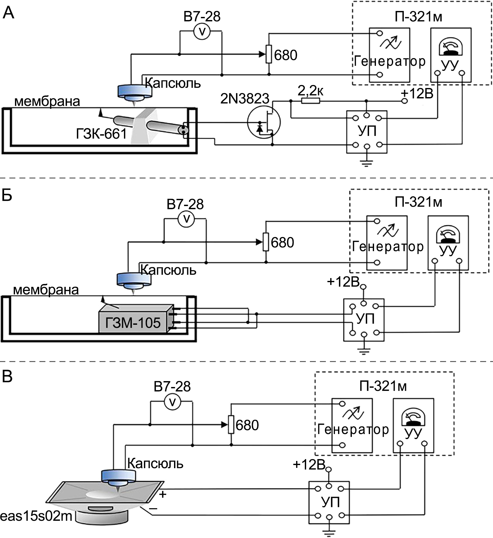 Во время испытания преобразователей на телефонный капсюль подавался синусоидальный электрический сигнал частотой от 300 Гц до 20 кГц и постоянной мощностью 1 мкВт от генератора прибора П-321М, что соответствует напряжению на катушке капсюля 4 мВ. Напряжение на катушке капсюля регулировалось органами управления генератора и дополнительно плавно регулировалось потенциометром на 680 Ом. Контроль напряжения на катушке капсюля осуществлялся по электронному вольтметру типа В7–28.