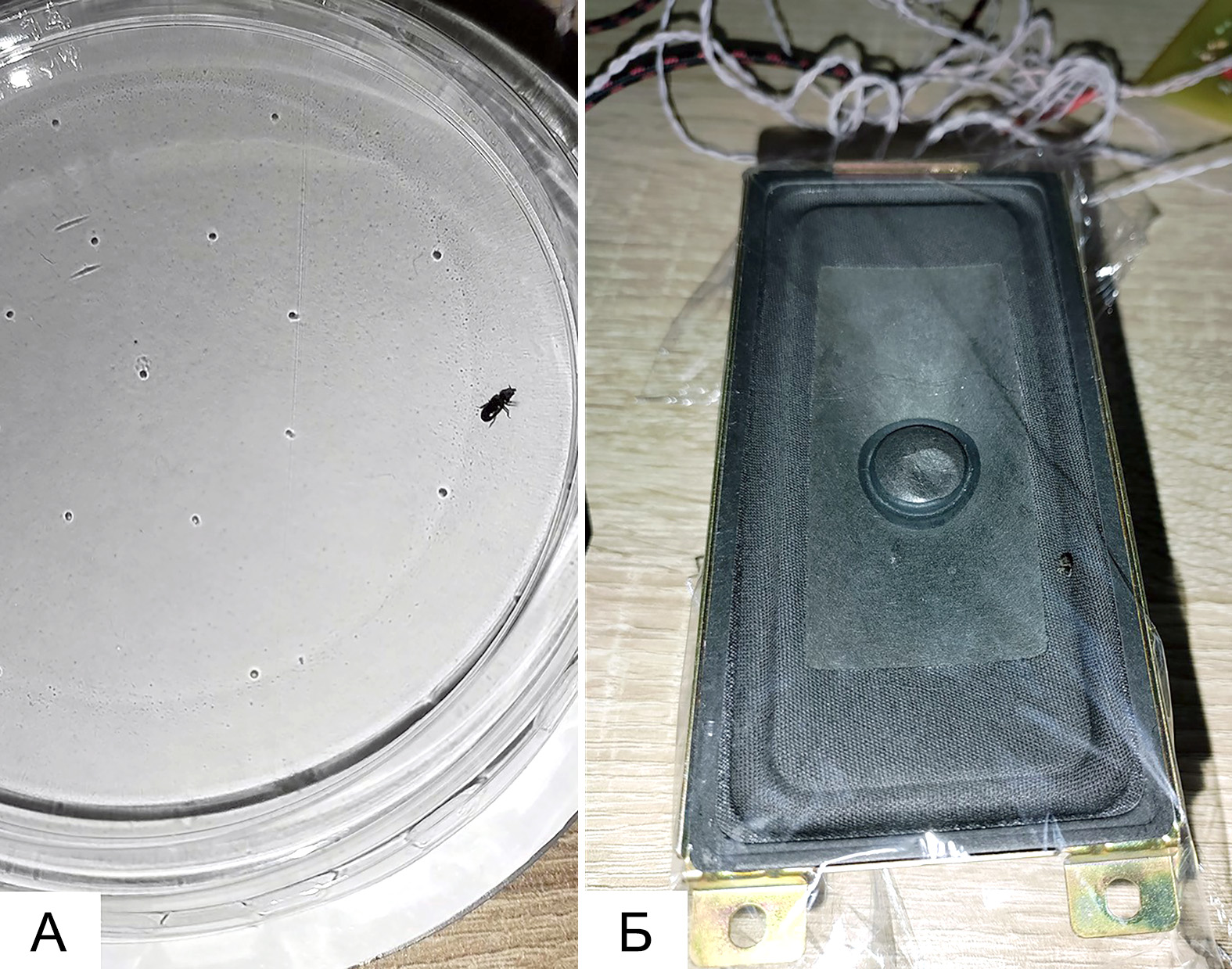 Рисунок 2 – Процедура записи вибрационных сигналов H. fenestratus: А – на электромагнитном звукоснимателе; Б – на электродинамической головке eas15s02m