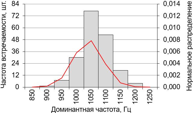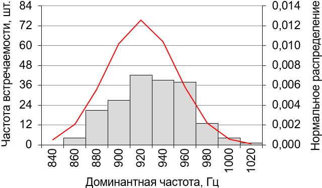 Для самцов H. fenestratus разброс доминантной частоты составил от 857,29 до 1002,01 Гц. В среднем доминантная частота для данного вида равна 920,38 ± 31,79 Гц (W = 0,98, p > 0,01). При этом, согласно рисунку 3, диапазон наибольшей встречаемости составил от 860 до 960 Гц. Наименьшая встречаемость характерна для диапазона от 857,29 до 860 Гц и от 960 до 1002,1 Гц.