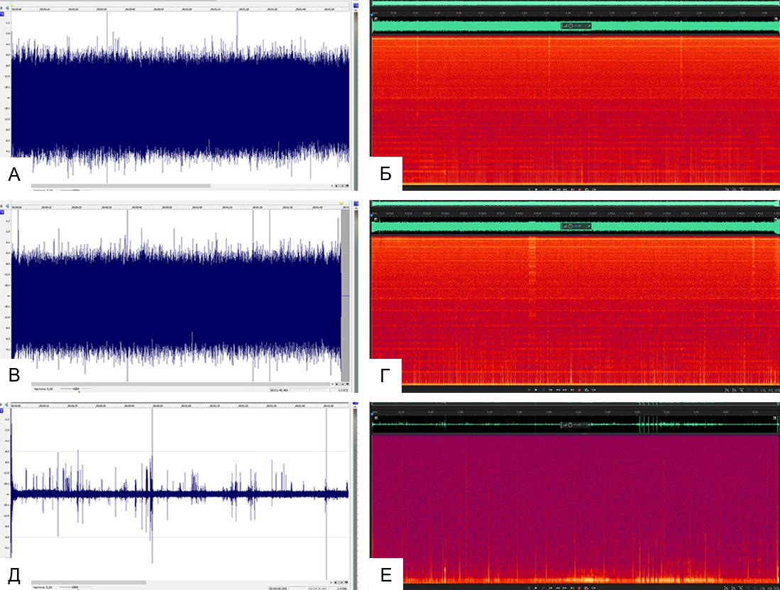 Рисунок 5 – Осциллограммы и сонограммы стрессовых сигналов H. fenestratus, выполненные преобразователе на основе: А, Б – пьезоэлектрического звукоснимателя; В, Г – электромагнитного звукоснимателя; Д, Е – электродинамической головки eas15s02m
