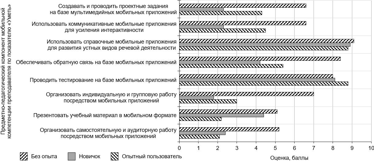 Преподаватели, являющиеся опытными пользователями мобильных технологий обучения, испытывают сложности в формировании критериев для выбора мобильных приложений и их использования в процессе обучения иностранному языку. Данные затруднения вызваны наличием большого количества разработок в области мобильных приложений, которые адаптированы в своих технических характеристиках под различные дидактические задачи. С другой стороны, очевидно, что неопытные пользователи высоко оценивают свою осведомленность о мобильных технологиях из-за отсутствия знаний о количестве разработок, их особенностей и характеристик. Следует отметить, что преподаватели, имеющие опыт использования мобильных технологий в процессе языковой подготовки студентов, продемонстрировали низкую самооценку по ряду показателей, в отличие от преподавателей, не имеющих опыта использования мобильных технологий. Распределение оценок по критерию «Уметь» представлено на рисунке 2.