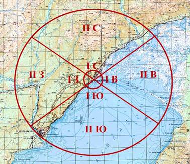 Рисунок 1 – Карта-схема пространственного зонирования района аэропорта Нижнеангарск и прилегающей территории. Обозначения: I – зона аэропорта; II – зона прилегающей территории в радиусе 15 км; С – северный сектор; В – восточный сектор; Ю – южный сектор; З – западный сектор