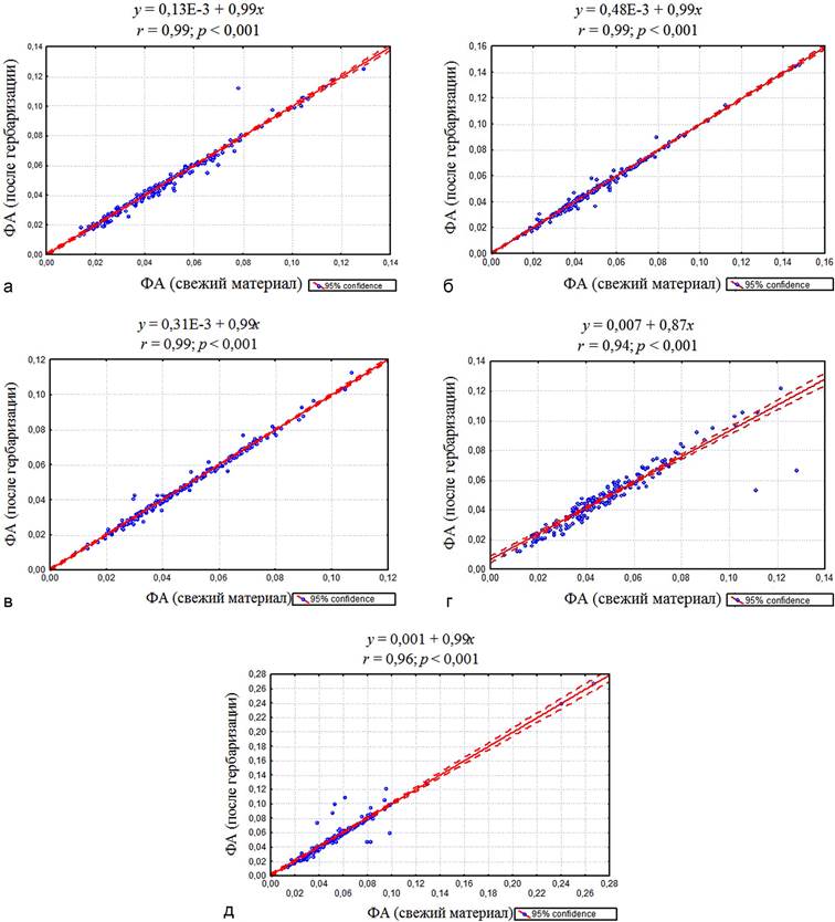 В ходе исследования результаты подвергали статистическому анализу с вычислением среднего арифметического (М) и его ошибки (m). Оценку взаимосвязи между значениями ФА, полученными при методе гербаризации, фиксации материала в спиртовом растворе и свежесобранным оценивали в ходе корреляционного анализа (вычисляли коэффициент корреляции – r), уровень статистической значимости коэффициента при р < 0,05. Статистический анализ выполнен в ПСП Statistica v10.0 (StatSoft, Inc., 2012).