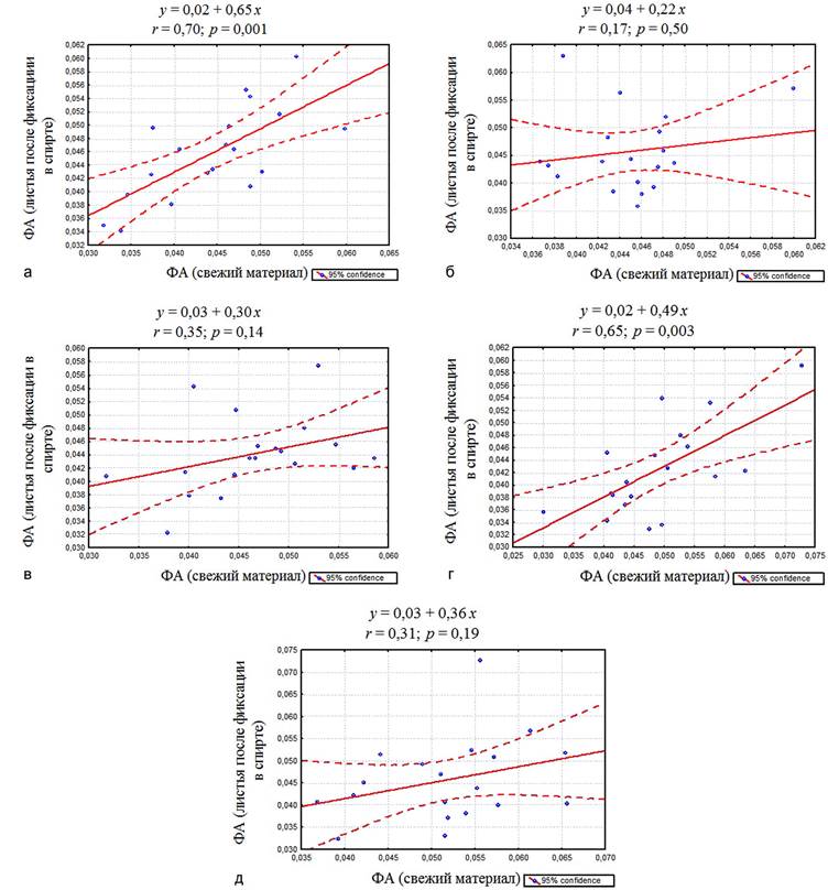 Рисунок 2 – Взаимосвязь в пределах дерева между уровнем ФА свежих и зафиксированных в растворе спирта листьев (n = 20) участки: а – Фон; б – Буфер-1; в – Буфер-2; г – Импакт-1; д – Импакт-2