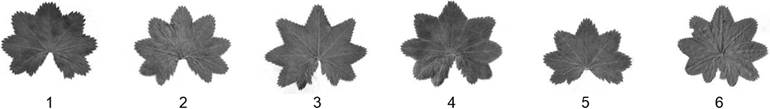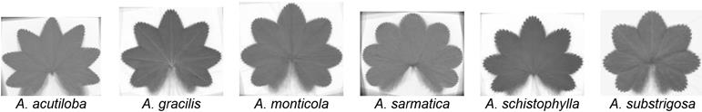 Получили изображения эталонной конфигурации листовой пластинки для микровидов A. acutiloba, A. gracilis, A. monticola, A. sarmatica, A. schistophylla, A. substrigosa. В природных ценопопуляциях лопасти листовых пластинок с треугольной формой у A. acutiloba и A. gracilis и с полукруглой формой у A. sarmatica варьируют по длине, ширине и форме верхушки. Краевые лопасти листовых пластинок этих микровидов расходятся под разными углами. По-видимому, различия уровня увлажнения почв в местообитаниях являются причиной существенной разницы в размерах и морфологических особенностях листовой пластинки A. gracilis. У A. substrigosa из разных ценопопуляций статистически значимые различия в размерах листовой пластинки не сопровождаются изменением ее формы. Комплекс морфометрических признаков листовой пластинки совместно произрастающих A. litwinowii, A. monticola, A. substrigosa в естественных и A. acutiloba, A. gracilis, A. hirsuticaulis в искусственных условиях имеет непрерывную изменчивость. При этом точность классификации листьев манжетки разных микровидов в конкретных условиях составляет порядка 80%.