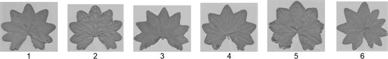 Рисунок 3 – Изменчивость листовой пластинки A. gracilis: 1 – полукруглые лопасти; 2 – полуяйцевидные лопасти; 3 – узко-треугольные лопасти; 4 – широко-треугольные лопасти; 5 – листовая пластинка почковидной формы с широко расходящимися краевыми лопастями; 6 – листовая пластинка округлой формы, практически со сходящимися краевыми лопастями