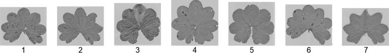 Рисунок 4 – Изменчивость листовой пластинки A. sarmatica: 1 – полукруглые лопасти, краевые лопасти расходятся почти под прямым углом; 2 – удлиненные полуяйцевидно-треугольные закругленные лопасти, краевые лопасти расходятся почти под прямым углом; 3 – очень короткие полукруглые лопасти, краевые лопасти расходятся под острым углом; 4 – удлиненные полукруглые лопасти, краевые лопасти соприкасаются; 5 – очень короткие полукруглые лопасти, краевые лопасти едва не соприкасаются; 6 – очень короткие округло-треугольные лопасти, краевые лопасти расходятся почти под прямым углом; 7 – широко-треугольные лопасти, краевые лопасти расходятся почти под острым углом