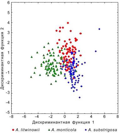 Листовые пластинки микровидов A. litwinowii, A. monticola, A. substrigosa, произрастающих на пойменном лугу в Сернурском районе, сопоставили по комплексу морфометрических признаков (табл. 2). Листовые пластинки этих микровидов статистически высоко значимо различаются по дискриминантным функциям (P < 0,001) (рис. 6). Точность классификации микровидов составляет 82%. Листовые пластинки группируются по принадлежности к разным микровидам, выделяются три «облака», но четкая граница между микровидами отсутствует. В большей степени смешаны листья микровидов A. litwinowii и A. substrigosa. Точность классификации микровида A. monticola (84%) и A. substrigosa (83%) практически на одном уровне. Больше количество ошибок наблюдается в классификации листовых пластинок A. litwinowii (78%).
