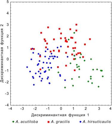Сходную картину результатов статистического анализа получили при сопоставлении листовых пластинок микровидов A. acutiloba, A. gracilis, A. hirsuticaulis из искусственных условий произрастания (табл. 3). Группы листовых пластинок различаются статистически значимо (P < 0,001), классифицируются с точностью 83% (рис. 7). Максимальная точность классификации (88%) у микровида A. hirsuticaulis. Практически на одном уровне точность классификации A. acutiloba (81%) и A. gracilis (79%). Близость этой пары микровидов показана рядом авторов по результатам исследования морфометрических признаков [22] и анализа генетического полиморфизма [23].