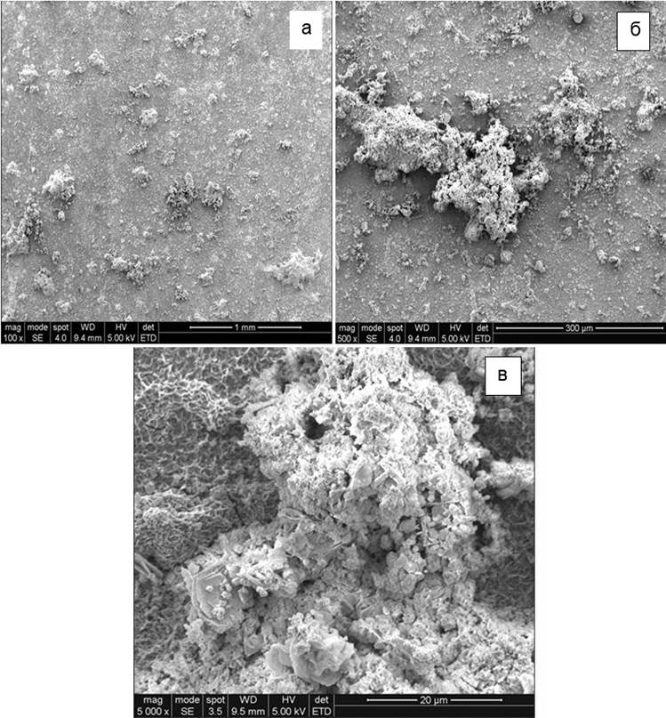 На рис. 1 представлены снимки поверхности образца после выдержки в модельной среде нефтяного микробоценоза при различных увеличениях. Снимки свидетельствуют, что в процессе испытания на поверхности металла образовались рыхлые, неравномерно распределенные отложения. Клетки самих бактерий в этих отложениях не выявили.