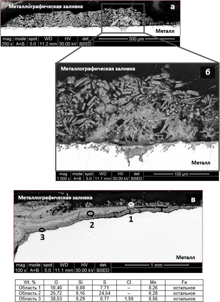 На рис. 2 представлен снимок продольного сечения образца изучаемой стали в упруго-отраженном излучении электронов. Отложения толщиной ~250 мкм имеют рыхлую и неоднородную морфологию (рис. 2: а, б), характерную для микробиологической коррозии [2, с. 44; 9, с. 6]. Локальный энергодисперсионный химический анализ, проведенный в характерных областях сечения (рис. 2: в), выявил присутствие в сечении соединений серы, оксидов железа и марганца. Наглядное распределение слоев с различным химическим составом дает исследование в характеристическом рентгеновском излучении, результаты которого представлены на рис. 3. Из рисунка следует, что слой с высоким содержанием серы расположен сверху, а под ним располагаются прослойки с оксидом железа и марганца. Кроме того, в слое продуктов коррозии присутствует кремний, как было выявлено ранее методом локального энергодисперсионного химического анализа (рис. 2: в). Подобное распределение элементов и состав слоев был ранее описан Е.А. Борисенковой [8, с. 100–103].