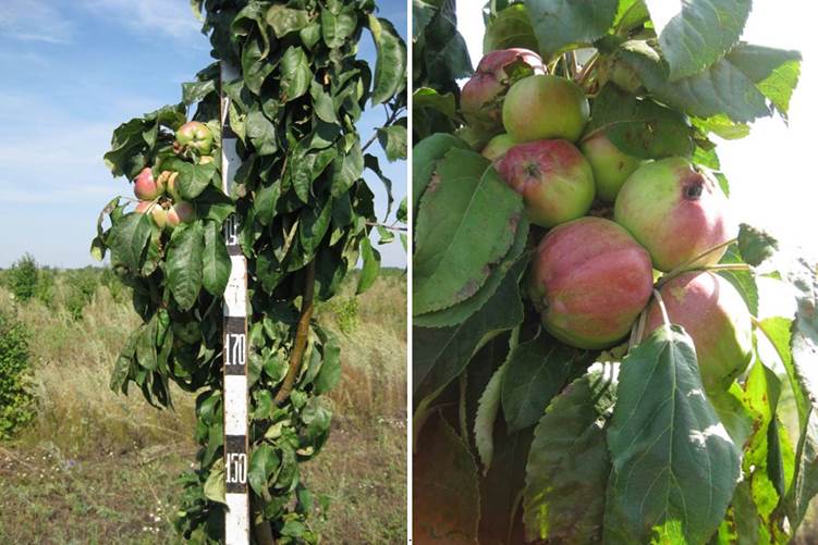 30–2–99. Колонновидная элитная форма. Скрещивание проведено в Самарской области в 1998 году, посев семян в 1999, отбор в элиту в 2010 году. Автор Г.И. Соболев. Дерево среднерослое, компактное, полукарлик на сильнорослых подвоях, среднезимостойкое. Подмерзания (почки-кора-древесина) после экстремальных промораживаний в разные годы оцениваются в 1–2 балла (таблица 2). Вступает в плодоношение на 2–3-й год от посадки однолетками. Плодоносит на кольчатках (спур-тип). Плодоношение ежегодное. Плоды крупные, одномерные, приплюснутые, широкоребристые. Окраска в виде размытых полос красного цвета на половину плода, кисло-сладкого вкуса со слабым ароматом. Плоды и листья среднеустойчивы к парше – 3 балла. [7, с. 126]. Во влажные благоприятные для заражения годы (2019–2020 гг.) парша на зараженных плодах не развивалась, погибала, не проникая внутрь плода. В Самарской области, согласно общепринятой методике, подобные сорта имеют среднюю полевую устойчивость к парше [5, с. 269–271]. Транспортабельность плодов во время съёма хорошая. Сорт универсального назначения. Достоинства – зимостойкость, относительная засухоустойчивость, полевая устойчивость к парше, плоды красивые. Недостатки – требует оптимального ухода (рис. 1, таблицы 3, 4).