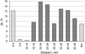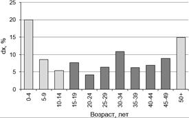 На графиках (рисунки 5, 6) прослеживаются пики смертности в детском возрасте, особенно велики значения в возрасте от 0 до 4 лет. Еще один пик наблюдается в возрастной когорте 25–29 лет, и связан он с женской смертностью. Основные показатели смертности приходятся на возраст после 35 лет, и затем плавно показатели увеличиваются к когорте «50+». Данные графика свидетельствуют о высокой детской смертности, что отмечалось ранее многими авторами [6; 19; 20].
