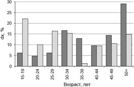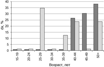 Рисунок 6 – Динамика показателей таблиц смертности у мужчин и женщин в группе значения dx. Колонки темного цвета – мужчины, колонки светлее – женщины
