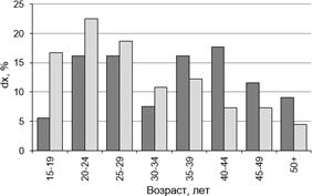 Таблица 9 – Показатели таблиц смертности мужчин и женщин, погребенных в Выхватинском могильнике, %