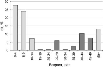 Таблица 2 – Показатели таблиц смертности, погребенных в Хвалынском I, II могильниках (суммарно), %