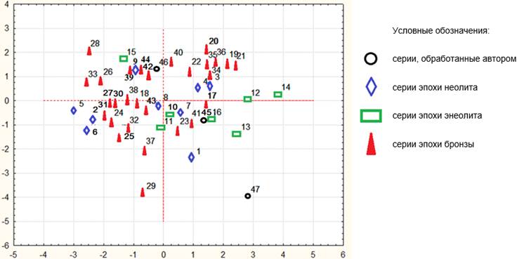 На рисунке видно, что серии заняли все пространство графика, что показывает отсутствие четкой закономерности половозрастной характеристики от исторической эпохи для конкретной группы серий, используемых в исследовании, исключением стали серии ямной (19–22) и катакомбной (34–36) культур, расположенные компактно в одном секторе.