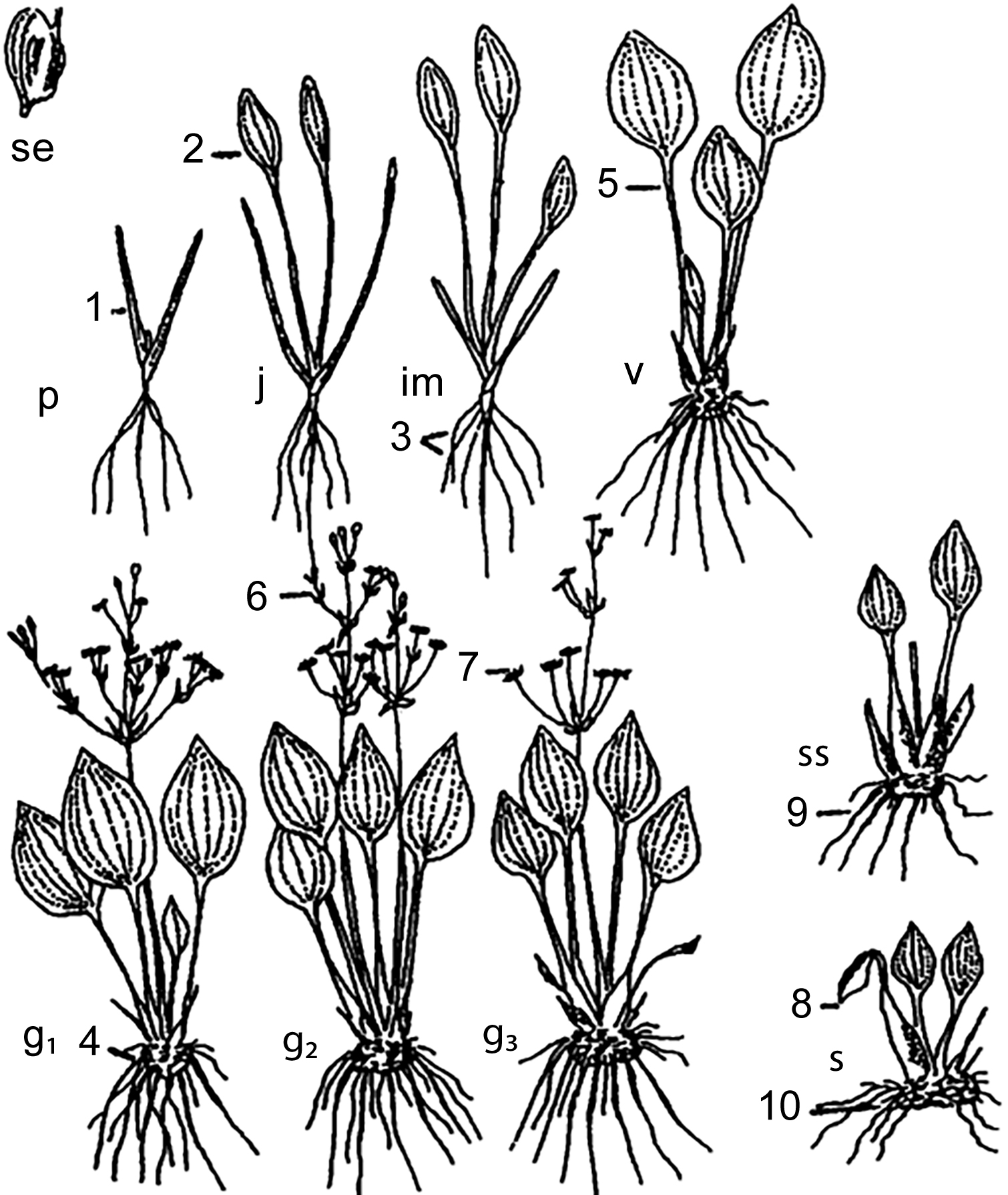 - – у молодых генеративных растений сохранялся розеточный побег I порядка, высота растений увеличивалась, формировались 1–2 безлистных удлиненных или полурозеточных генеративных побега. На розеточном побеге формировались 1–4 почек возобновления, из которых в дальнейшем развивались боковые розеточные побеги II порядка. Соотношение длины черешка к длине листовой пластинки равно 2:1. Ширина листьев возрастала. Диаметр корневища достигал 0,7–2,4 см;