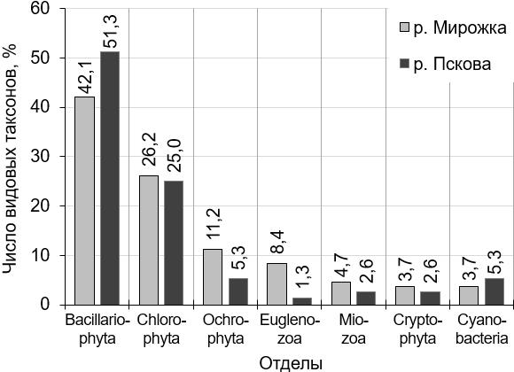 В сентябре 2019 г. в фитопланктоне р. Мирожки выявлено 107, а р. Псковы – 76 видовых и внутривидовых таксонов (ВВТ) водорослей, относящихся к 7 отделам: Bacillariophyta, Chlorophyta, Ochrophyta, Cryptophyta, Cyanobacteria, Euglenozoa, Miozoa (рис. 2).