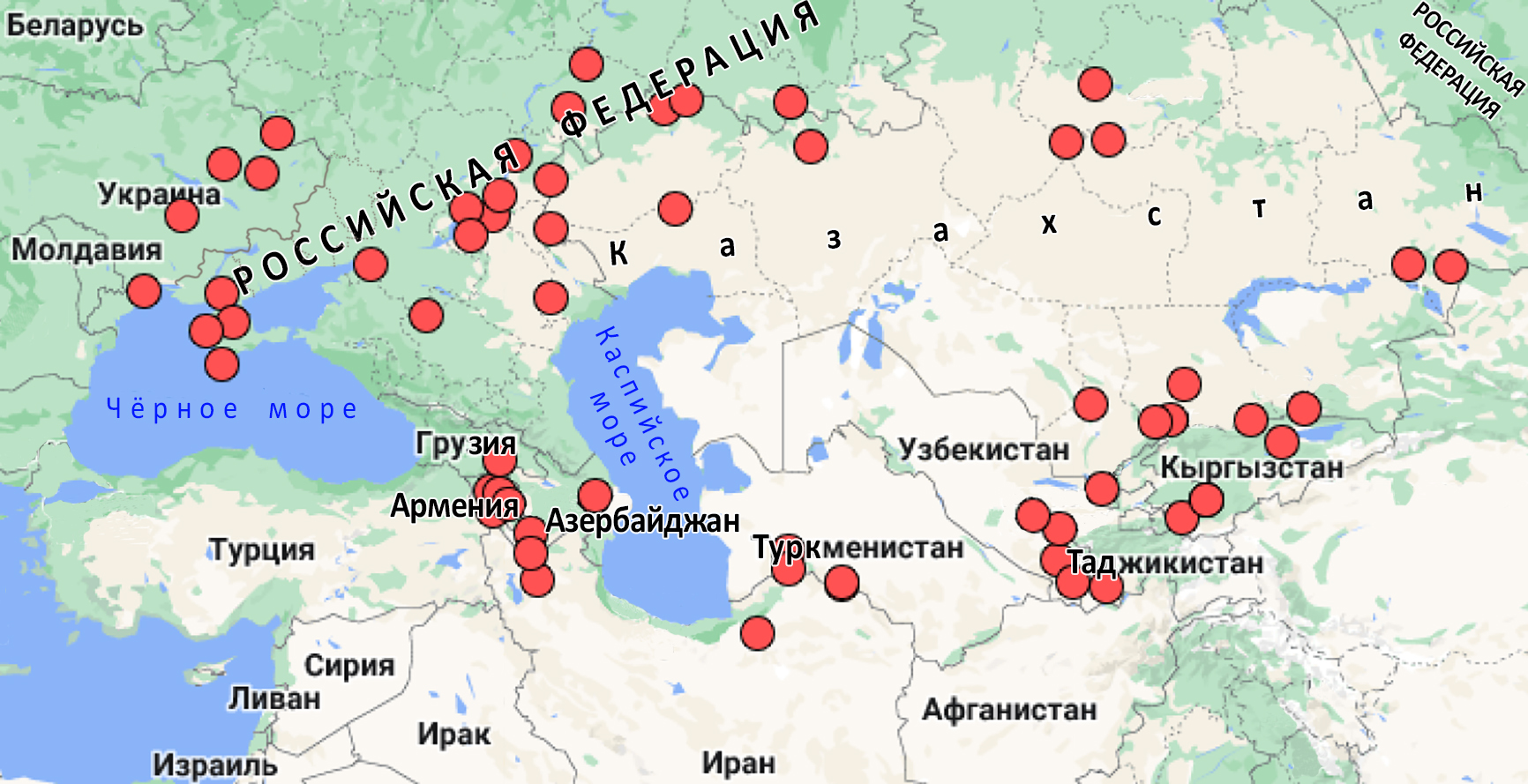 Основой для составления карты ареала T. abstersa послужили материалы коллекции имаго этого вида в Зоологическом институте РАН по его распространению, включающие около 70 мест их сборов. В задачи исследований входило установление географических координат T. abstersa по данным этикеток сборов, которые послужили основой для составления карты распространения вида с помощью картографического онлайн-сервиса (рис. 1). На следующем этапе проводился сопряженный анализ зонально-ландшафтных природных условий возделывания люцерны и мест сбора имаго лентокрылки Timia abstersa.