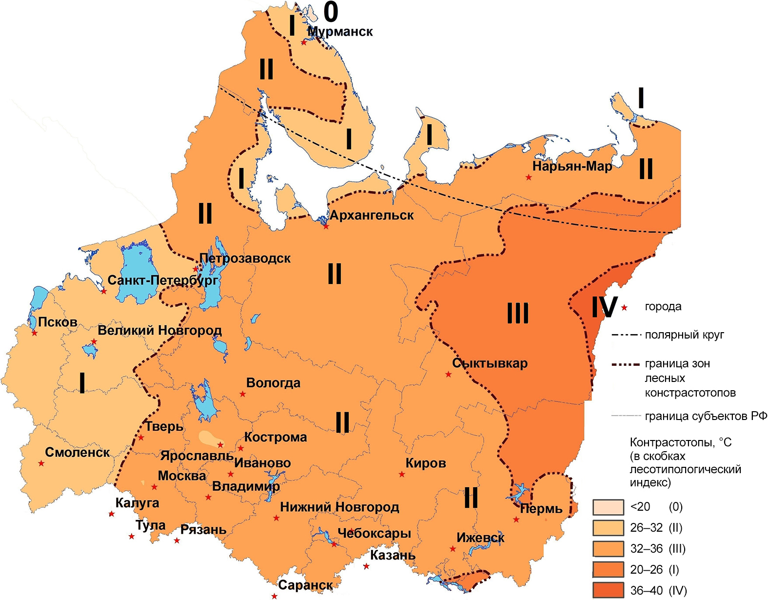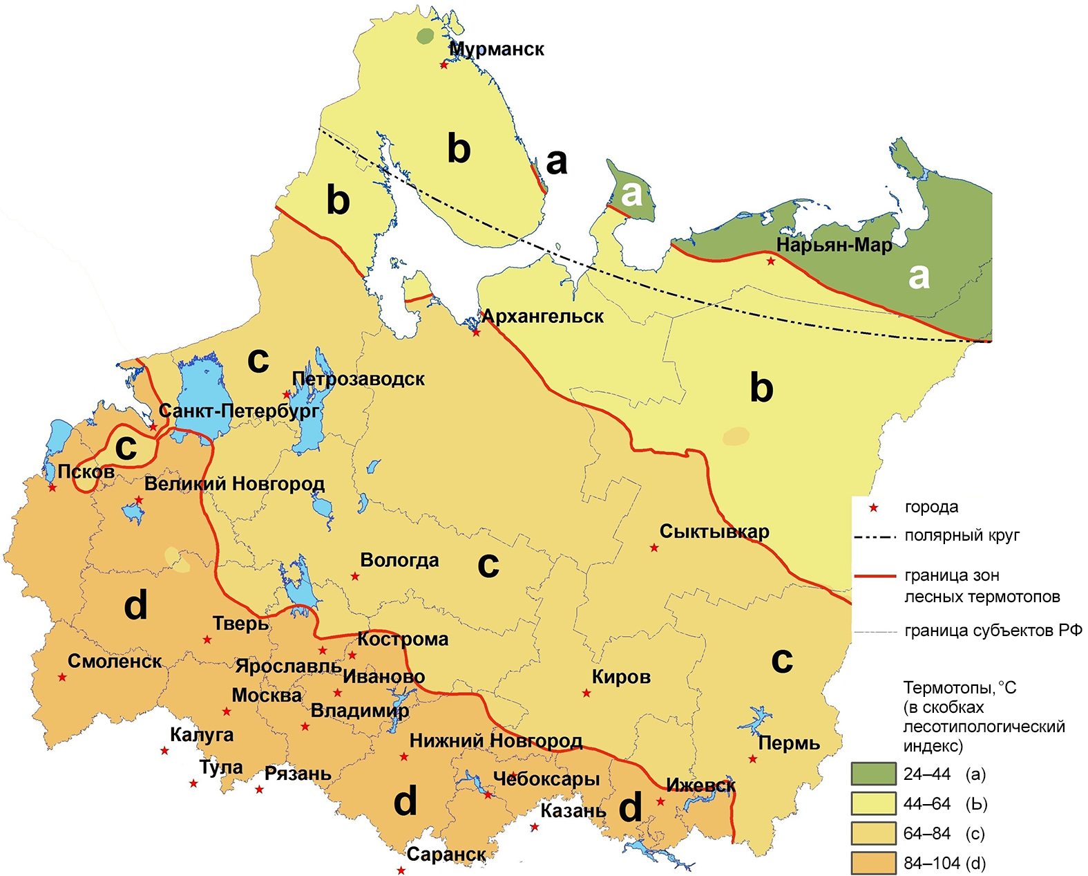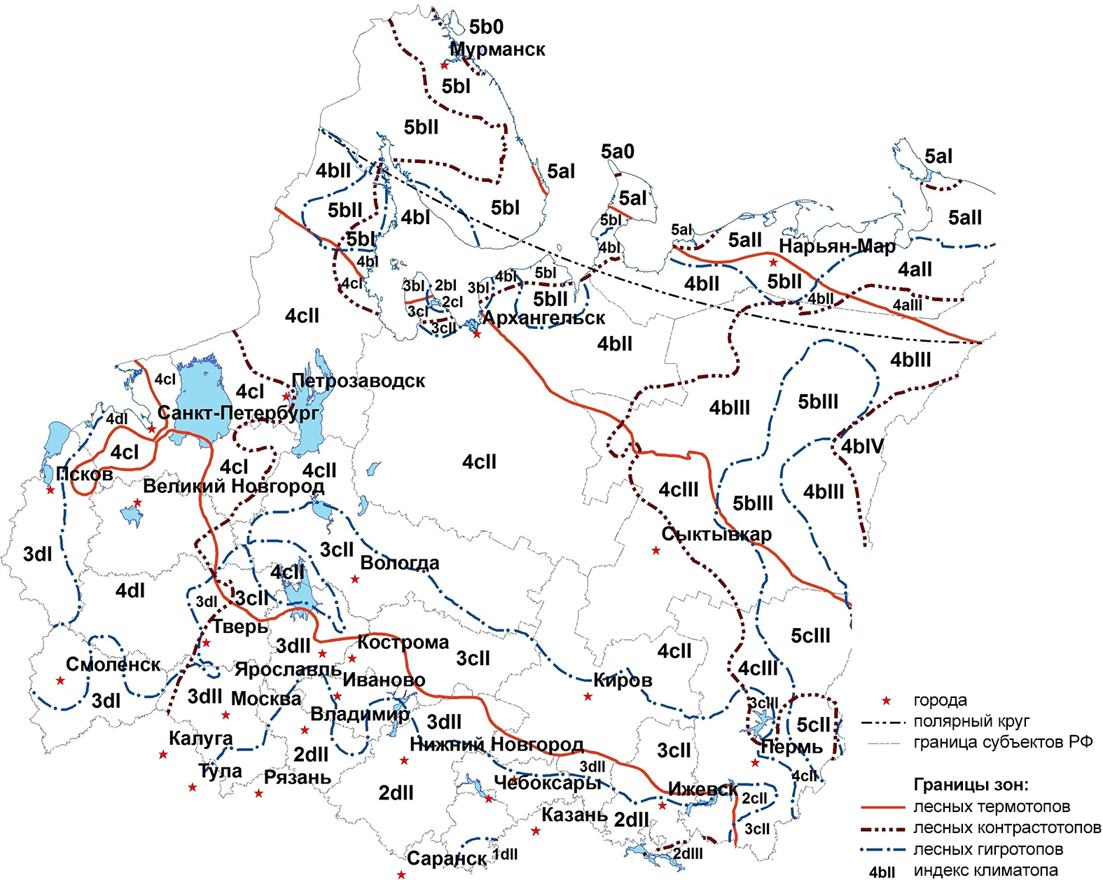 Рисунок 1 – Термотопы (климаты трофотопов) и тепловые лесотипологические зоны севера Европейской России (пояснения к легенде в тексте, также тут и далее показаны крупные озера и водохранилища)