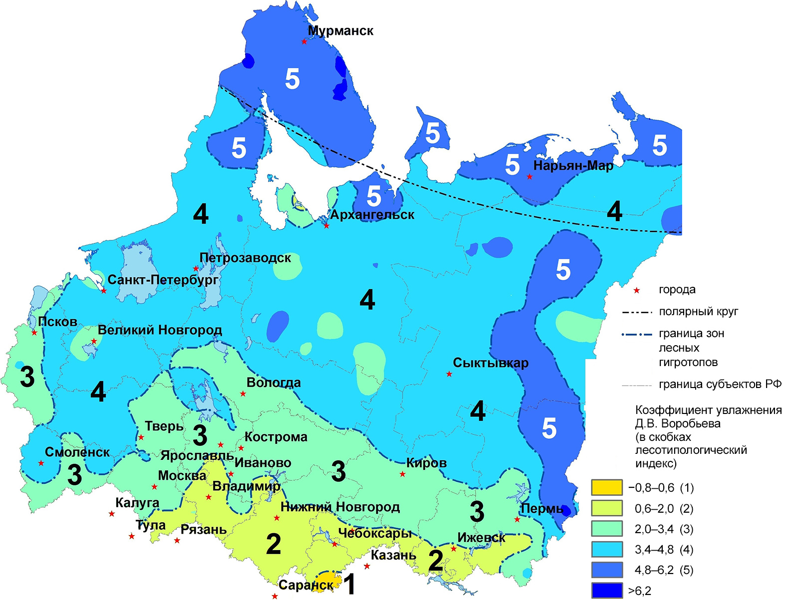 По режимам увлажнения (рис. 3) на севере Европейской России выделяются следующие зоны климатов гигротопов (в скобках приводится индексация, принятая Д.В. Воробьевым [8; 15; 16]).