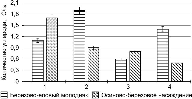 Согласно проведенным исследованиям, ежегодно с надземным опадом на поверхность почвы березово-елового насаждения поступает 1,1 тС/га, в том числе с древесным – 0,7, с опадом растений напочвенного покрова – 0,4 тС/га, осиново-березового – 1,7, 1,4 и 0,3 тС/га соответственно (рис. 1). Как известно, в лиственных лесах количество опада и, как следствие, углерода в нем выше, чем в хвойных [1; 2; 9; 16]. Количество углерода, поступающего с древесным опадом в ельниках средней тайги Республики Коми, занимает промежуточное значение между исследуемыми насаждениями и содержит 0,9 тС/га, в то время как в опаде растений напочвенного покрова практически такое же – 0,3 тС/га [4].