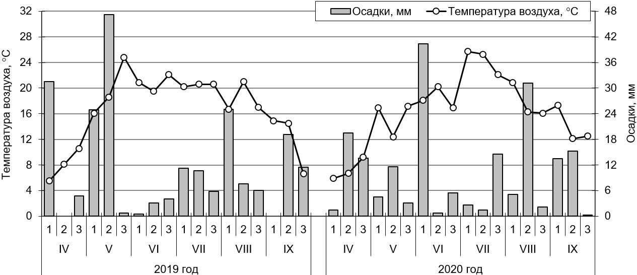 Рисунок 1 – Особенности погодных условий вегетационных периодов 2019 и 2020 гг. (по данным Приволжского УГМС для г. Самары). IV–IX – месяцы; 1–3 – декады