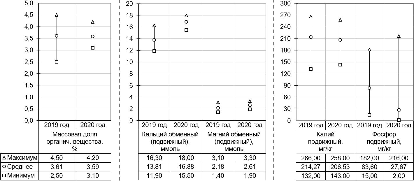 Химический анализ проб почвы проводили по следующим показателям: pH водный [23], pH солевой [24], массовая доля органического вещества [25], калий подвижный и фосфор подвижный [26; 27], кальций обменный и магний обменный [28]. Статистический анализ полученных данных проводили с использованием пакета статистического анализа MS Excel (описательная статистика).