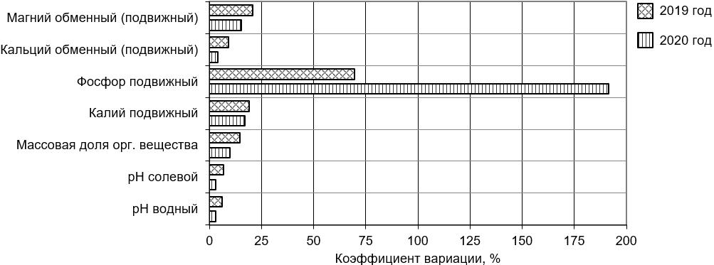 Выявленные различия как между пробами одного года, так и для показателей разных лет весьма убедительно иллюстрируют значения вычисленных нами коэффициентов вариации (рис. 3). Они также подтверждают высокую стабильность значений водного и солевого pH, умеренную изменчивость содержания органического вещества, калия, магния и кальция.
