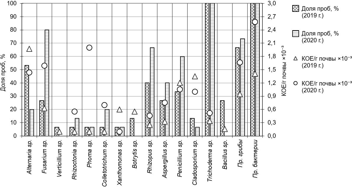 Результаты выявления в почвенных пробах 2019 и 2020 гг. присутствия и численности различных представителей почвенного микробиома отражены на рис. 4.