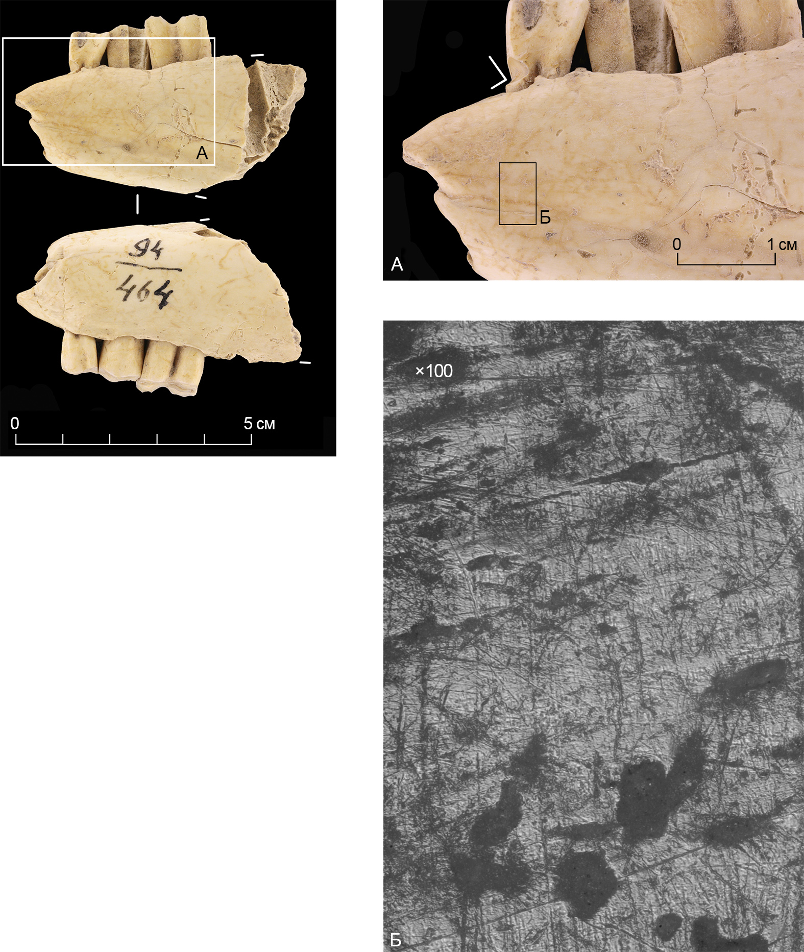 Поверхность покрыта многочисленными длинными царапинами разной ширины с ровными бортами, которые распространяются по язычной стороне кости регулярными однонаправленными рядами перпендикулярно нижнему краю кости и под наклоном (рис. 1: Б; рис. 2: А). На щечную сторону кости следы использования распространяются в меньшей степени. У небольшого фрагмента нижней челюсти отмечена интересная деталь: здесь в результате использования произошло истирание дентина первого малого коренного зуба с образованием канавки (рис. 1: А). Поверхность кости вокруг зуба также отличается интенсивной заполировкой и покрыта многочисленными линейными следами, которые как бы обтекают зубной ряд. У челюсти с наиболее целым диастемом (рис. 3) следы использования распространяются, главным образом, по верхнему краю, сглаживая поверхность кости.