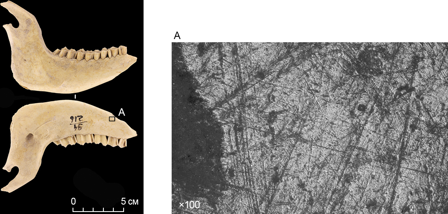 В итоге проведенного трасологического анализа установлен комплекс макро- и микроскопических следов износа, что указывает на использование нижнечелюстных костей в кожевенном производстве. На этом основании их следует отнести к категории тупиков для мездрения, разминания шкур. Наличие выразительных, однонаправленных, иногда довольно крупных, линейных следов, вероятно, указывает и на использование орудий при удалении волосяного покрова животных (волососгонка), который содержит мельчайшие абразивные частицы. С этим, скорее всего, связана и канавка на дентине зуба одного тупика, которая могла образоваться только в результате трения о довольно жесткий материал. Интенсивный износ свидетельствует о длительном использовании как минимум двух предметов (рис. 1, 2). Исходя из характера следов обработки и использования, орудия держались в правой руке за ветвь и тело нижней челюсти и движения при работе имели разнонаправленную кинематику.