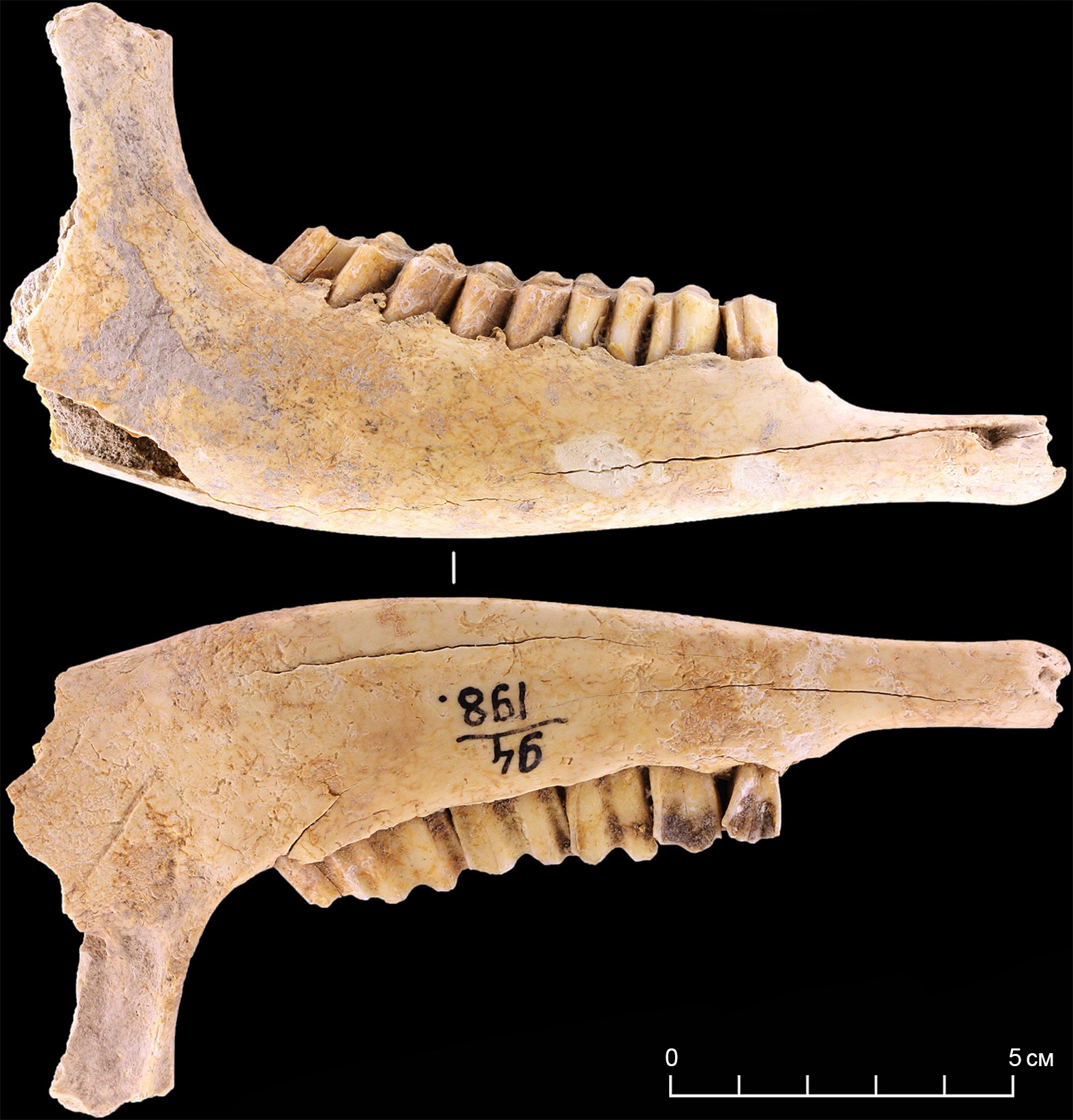 В ходе работы с сохранившимися материалами было обращено внимание на несколько нижних челюстей МРС, на которых, предположительно, имелись следы рабочего лощения. Одна из них, из раскопок 1993 г. (№ 342 или БД = 29 – номер приведен согласно Базе данных, формируемой в рамках выполнения научного проекта РНФ № 22-18-00065, https://rscf.ru/project/22-18-00065), – это симфизная часть левой нижней ветви челюсти овцы или козы; животное молодое, 1,5 года, забой примерно в конце лета (авторы благодарят к.и.н. А.К. Каспарова (ИИМК РАН, Санкт-Петербург) за археозоологические определения). Следующие три, происходящие из раскопок 1994 г., – правая ветвь нижней челюсти овцы, животное взрослое (№ 198, БД = 30); правая ветвь нижней челюсти овцы, животное взрослое (№ 216, БД = 31); обломок симфизной части правой нижней ветви челюсти овцы (№ 464, БД = 32).
