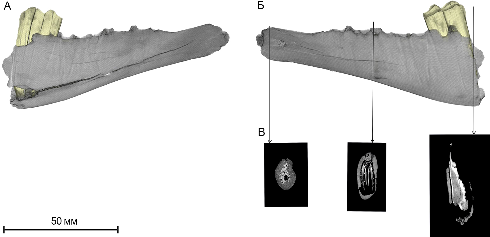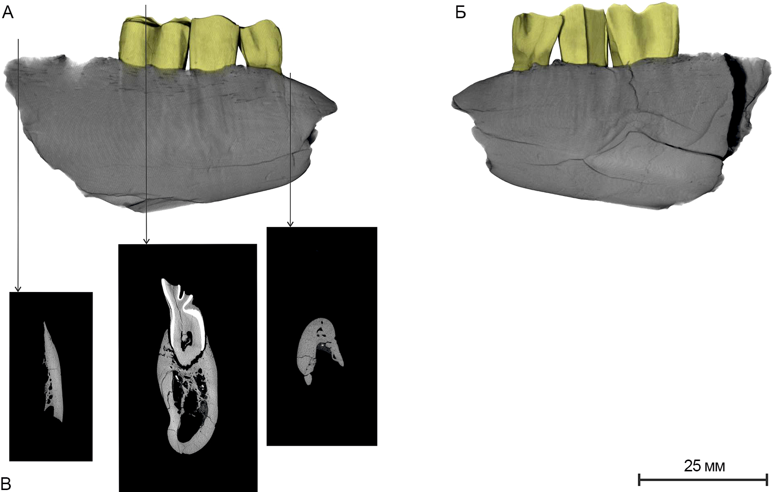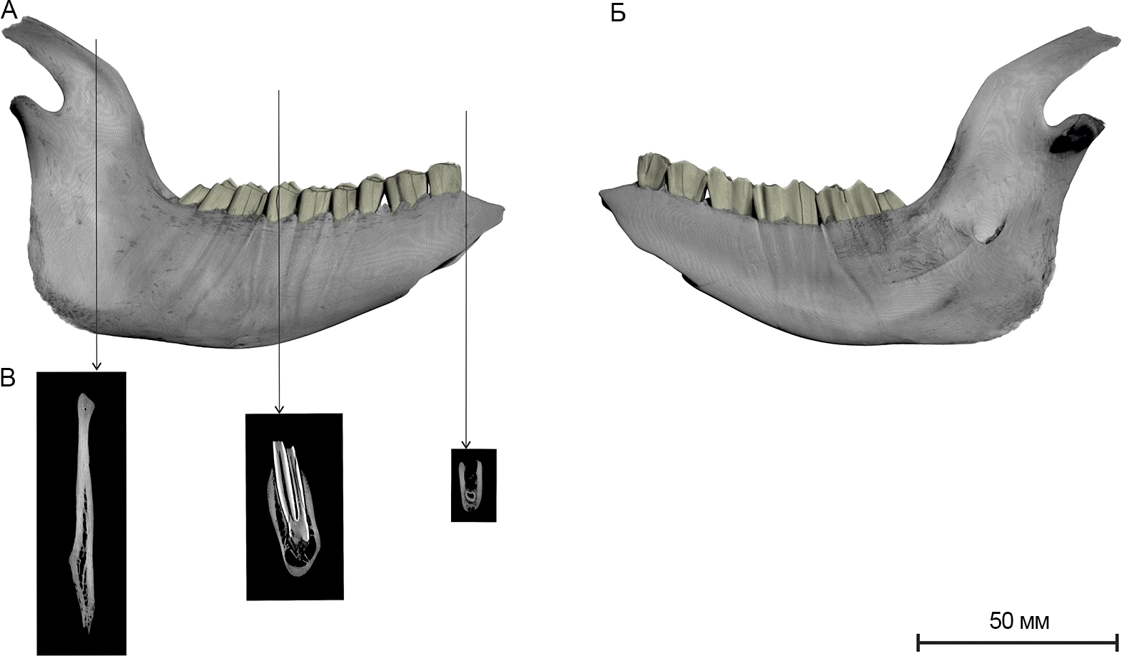 6. Рисунок 5 – Поселение Бай-Кият I. Образец БД = 31 № 216. Щечная (А), язычная (Б) стороны и томографические срезы (В). Исследование: А.М. Кульков
