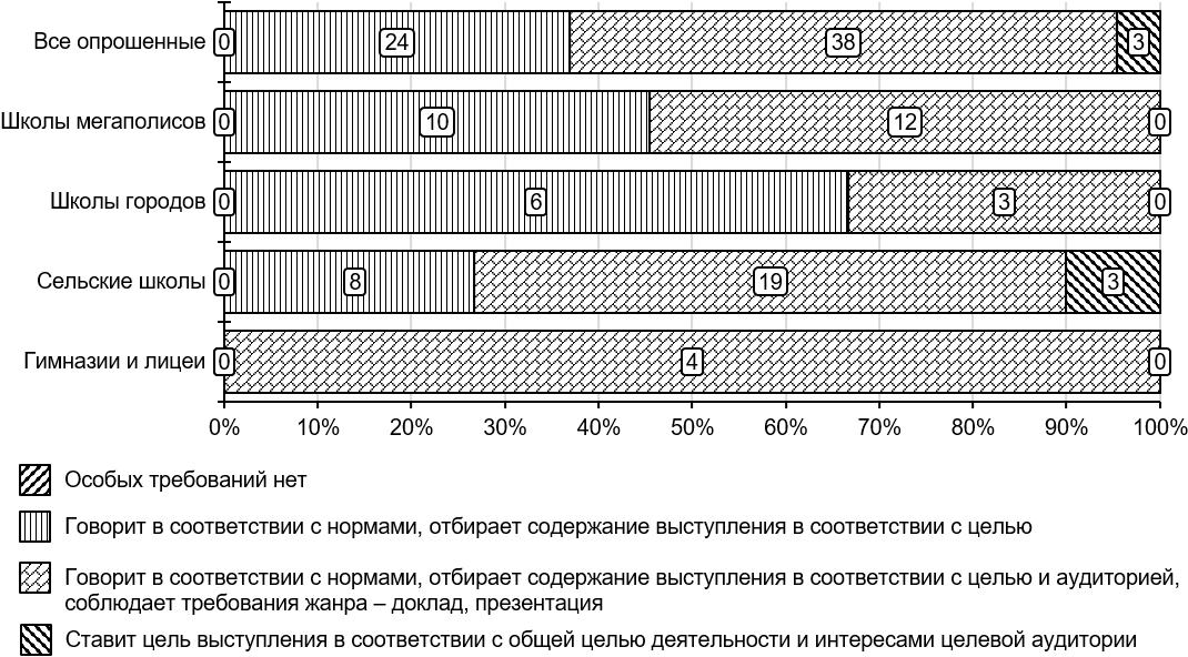 Предъявляя требования к публичному выступлению, представители работодателя ожидаемо видят его сквозь призму монолога учителя на уроке. Это отчасти размывает фокус универсальной компетенции как ресурса для ситуации неопределенности. Тем не менее предложенные дополнения важны, поскольку касаются языковых средств и средств выразительности речи, связанных со спецификой основной целевой аудитории. Помимо соблюдения норм русского языка и норм публичной речи, респонденты неоднократно обращали внимание на интонационную выразительность речи и четкую артикуляцию (произношение). Следует заметить, что такие признаки речи могут сыграть негативную роль при коммуникации с целевой аудиторией, отличной от обучающихся начальных классов. Но представители работодателя, по-видимому, в первую очередь рассматривают универсальную компетенцию как базу для профессиональных и игнорируют ситуации, в которых вновь принятый на работу учитель начальных классов выступает перед, например, коллегами или «посторонними взрослыми», руководством организации и даже родителями. В частности, они приводят такое объяснение: «в начальной школе это (грамотно построенная речь учителя) обеспечивает оптимальные условия для усвоения детьми учебного материала». Респонденты не видят принципиальной разницы между требованиями уровня I и уровня II, где список дополняется требованиями к соблюдению норм жанров устной деловой коммуникации и к отбору содержания выступления в соответствии со спецификой аудитории. Действительно, эти дополнения не играют никакой роли, если рассматривать монолог исключительно в контексте ведения урока.