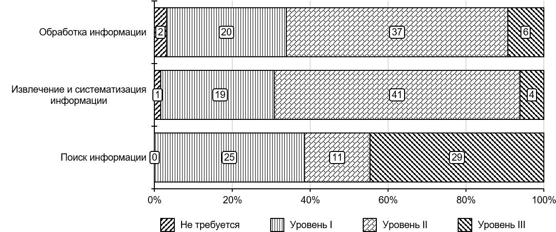 При этом уровень запросов не зависит от типа населенного пункта, в котором находится общеобразовательная организация. Все респонденты не считают значимой ситуацию, в которой учитель начальных классов, приняв задачу своей профессиональной или социально-значимой деятельности, формулирует запрос на информацию – как правило, ситуативную информацию, – которая позволяла бы эту задачу решить. От 75% до 36% опрошенных в каждой категории считают, что этот запрос учитель должен формулировать в свой адрес, осуществлять поиск требуемой информации и верифицировать источники, подтверждая достоверность информации. Представляется, что небольшая доля запросов, сформулированных на уровне II, объясняется именно тем, что респонденты не видят ценности в простой констатации того факта, что решить поставленную задачу деятельности без конкретной информации нельзя. Это видится им первым шагом в деятельности по самостоятельному поиску информации и отдельной ценности в их глазах не имеет. Такая интерпретация позволяет объединить ответы, определив требования к деятельности учителя по поиску информации на уровне III.